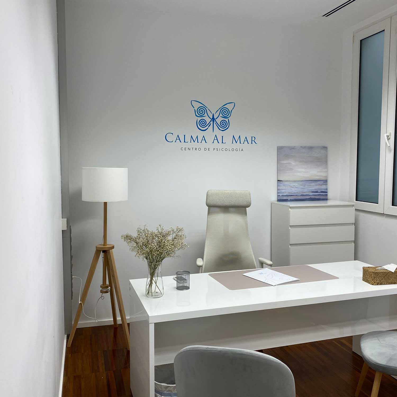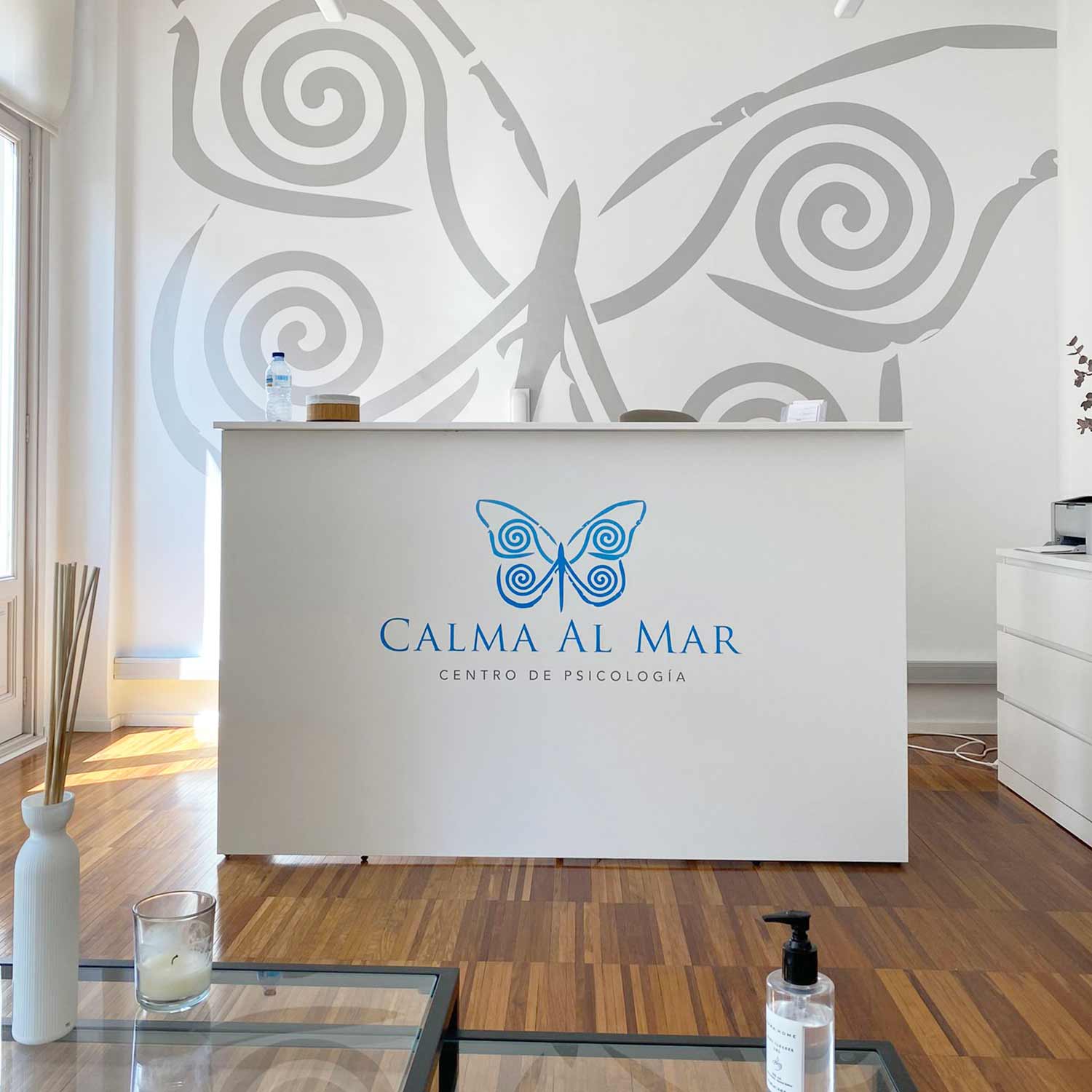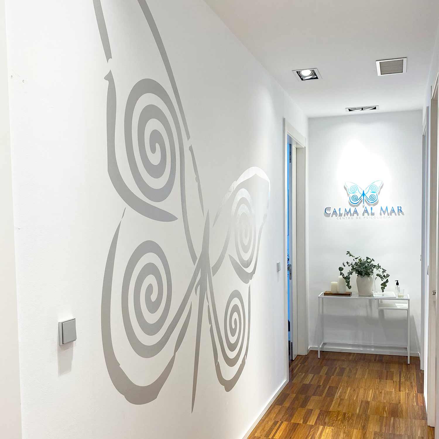 Decoracion y diseño en piso en el centro de Valencia gabinete de psicología. Creación de logotipo y decoración paredes interiores y despachos además de señalización de puertas.